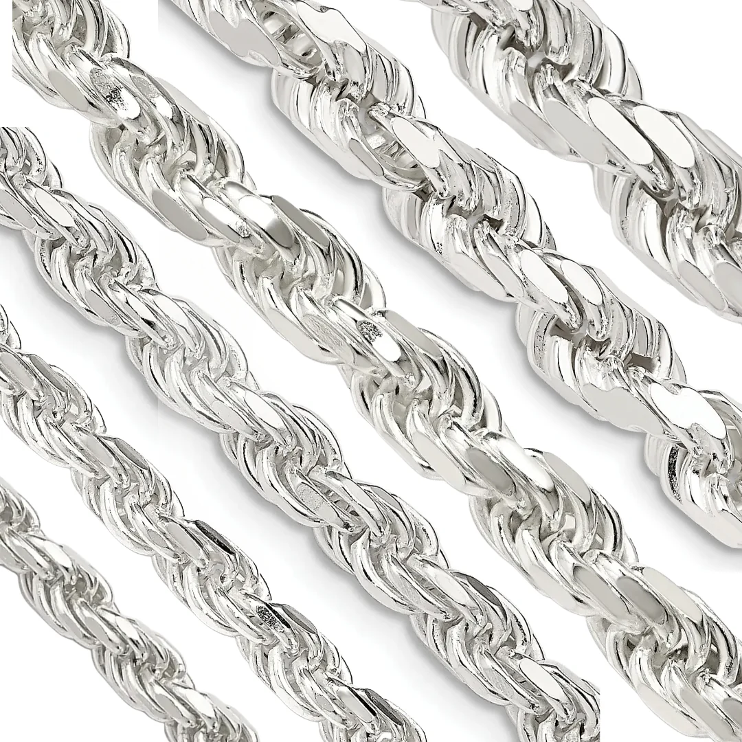 This is a SOLID (NOT HOLLOW), 925 Sterling Silver Rope Chain. It is highly polished which gives it a shiny finish. This is a non-fading and anti-tarnish chain. It is made from the highest quality material and it will never turn your neck green.