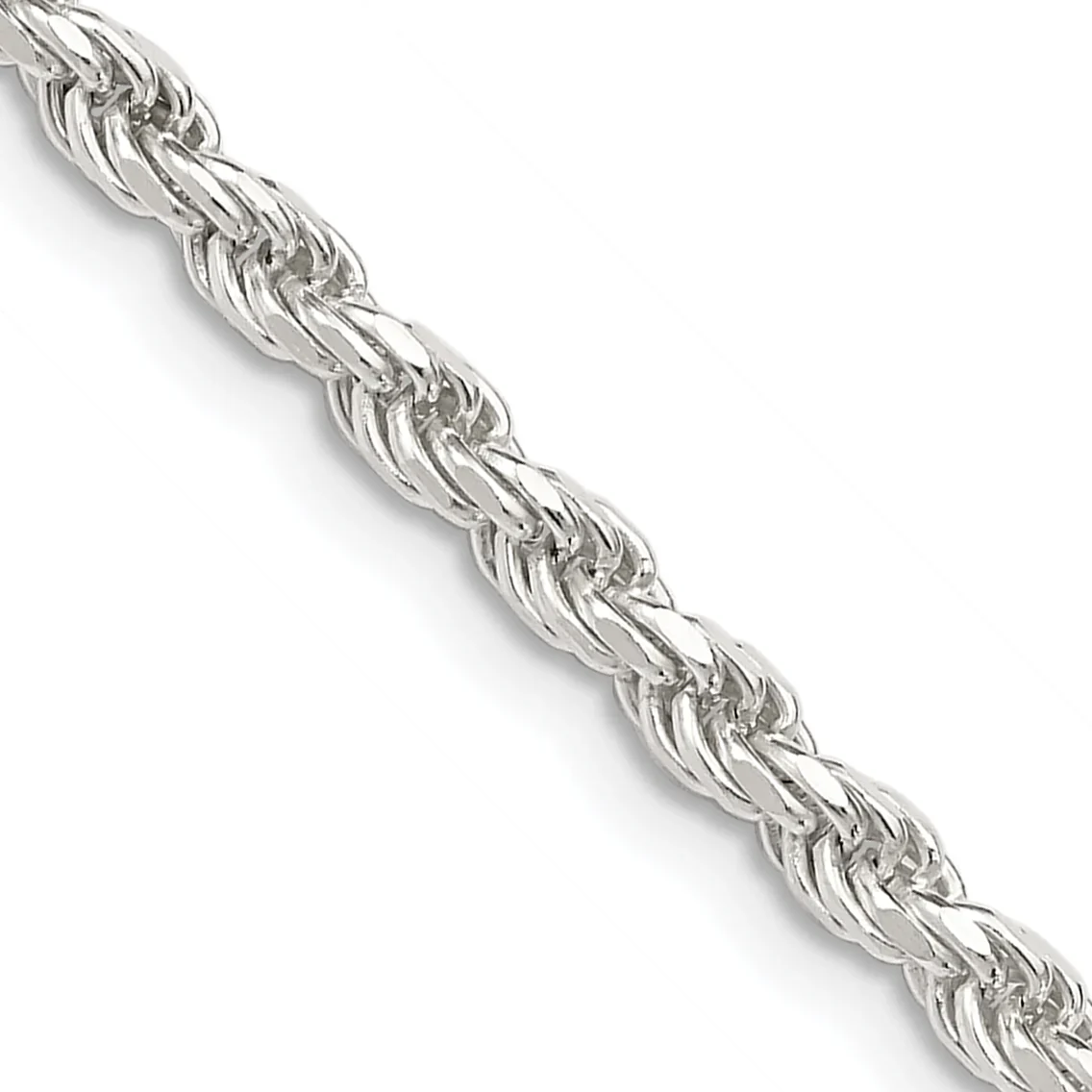 This is a stunning 3mm Solid Rope 925 Necklace Diamond Cut Sterling Silver chain, expertly crafted in Italy with a diamond cut finish for the perfect shine. Its high polish adds a touch of elegance to any outfit. This solid piece is made to perfection. This necklace is a must-have accessory for any jewelry collection. It can be worn by men, women and children.