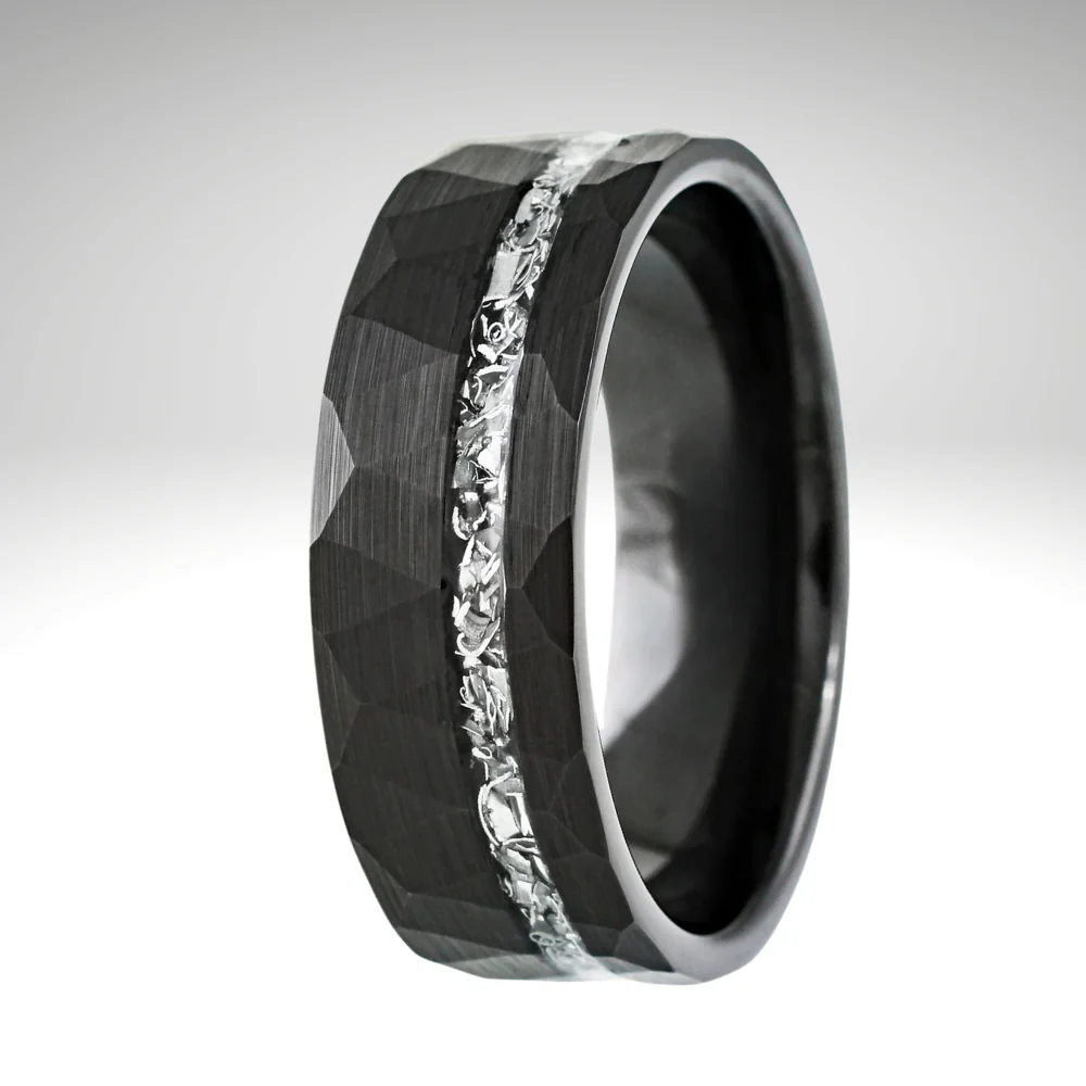 This striking tungsten band showcases a brushed black finish complemented by an off-center asymmetrical silver faux meteorite inlay, creating a sophisticated, modern aesthetic. Crafted from genuine tungsten, this ring delivers exceptional durability and weight that discerning wearers appreciate. The comfort-fit design features a subtle dome on the interior for all-day wearability, whether worn casually or for special occasions.
